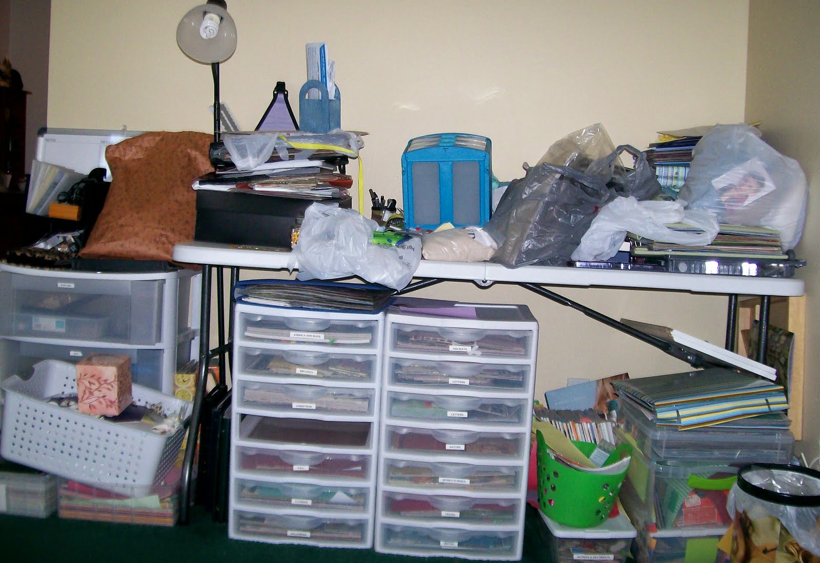 I printed out the wonderful free printable and picked four spots in my house! I am two weeks behind though but I choose to work on the hardest one first. My scrapbook space is the most cluttered space in my house! I am so embarressed to even share these pictures but here is the before: